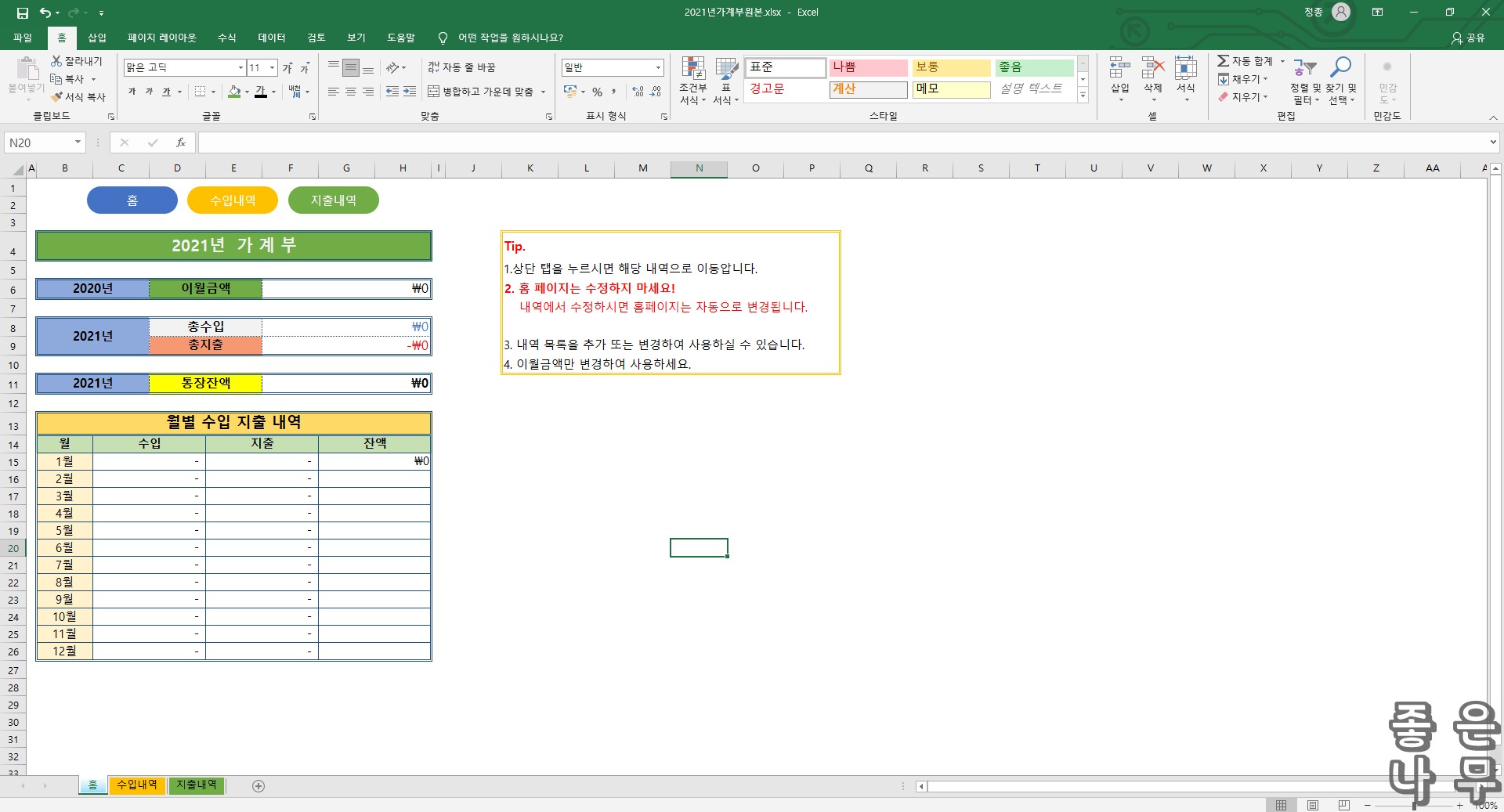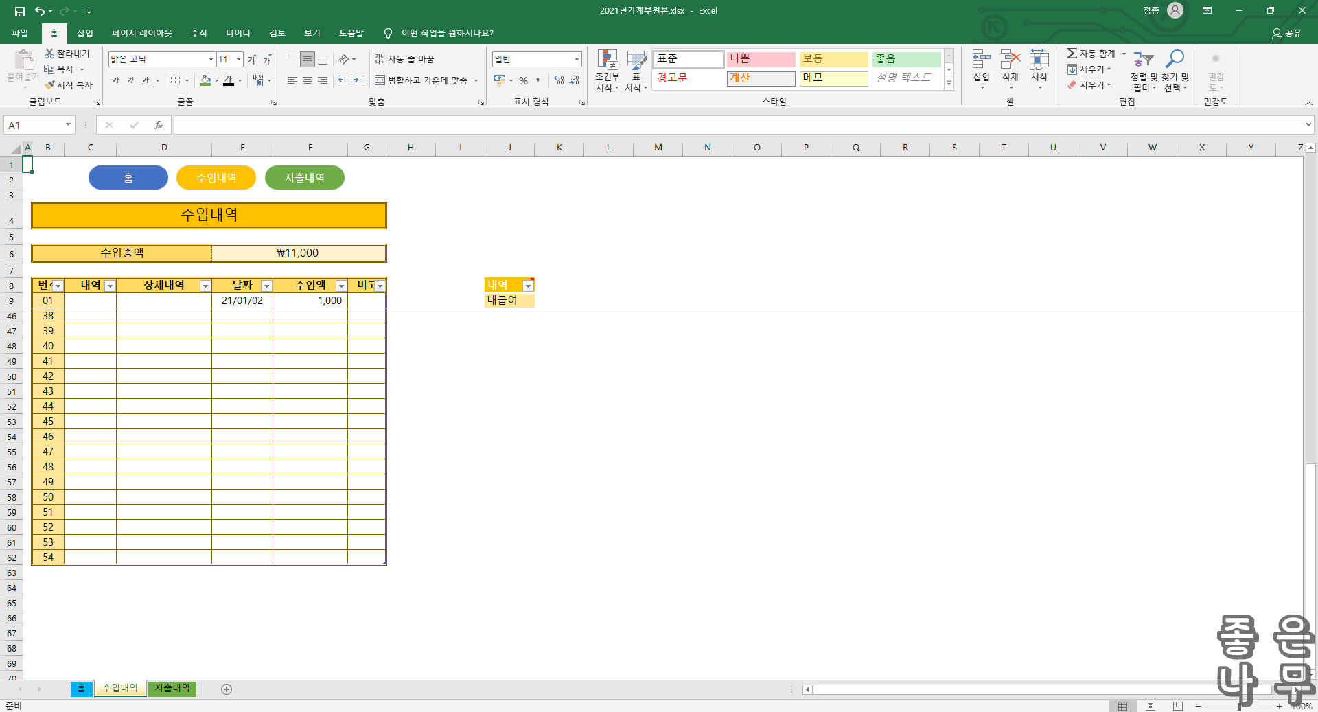 엑셀 2021년 자동 가계부입니다.