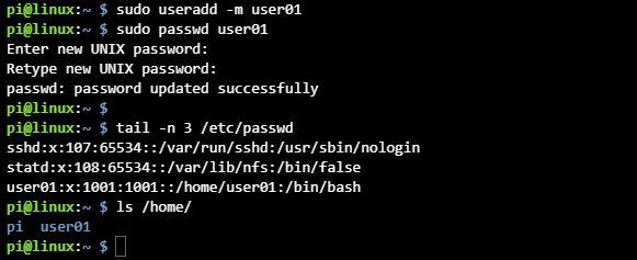 sudo useradd -m user01(생성할 유저ID와 폴더명)