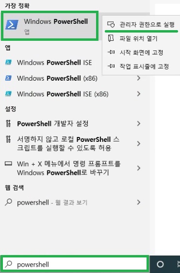작업 표시줄 - 돋보기 - powershell 검색 후 위에 보이는 Windows PowerShell 마우스 우측클릭 관리자 권한으로 실행을 클릭