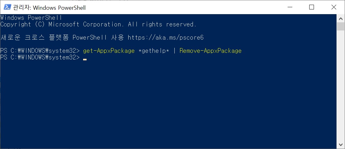 get-AppxPackage *gethelp* | Remove-AppxPackage 입력하고 엔터