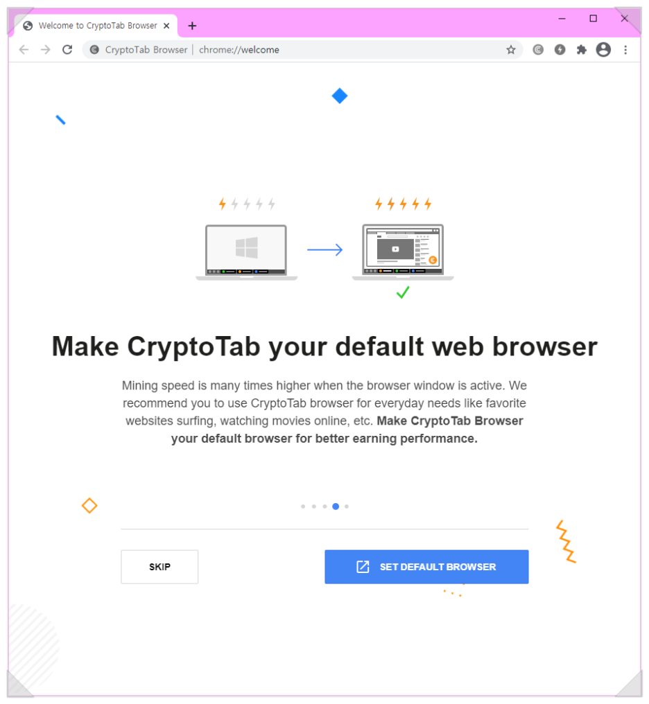 3. 기본 브라우저로 사용할 것인가 물음이 나오면 채굴만이 목적이면, SKIP을 누르고, 크립토탭을 기본브라우져로 설정하려면 SET DEFAULT BROWSER 를 선택합니다.