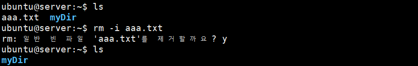 aaa.txt를 정말로 삭제할 것인지 확인 메세지가 나오며, y를 누르고 엔터를 누르면 삭제됩니다. |